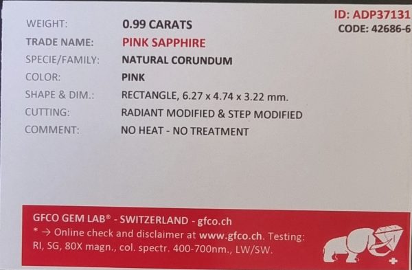 Experience the perfect intersection of natural purity and modern brilliance with this 0.99-carat Pink Sapphire. Nearly reaching the coveted 1-carat mark, this gemstone features a Radiant Modified Cut, which combines the elegant silhouette of a rectangle with the intense, multi-faceted sparkle typically found in round brilliant stones.