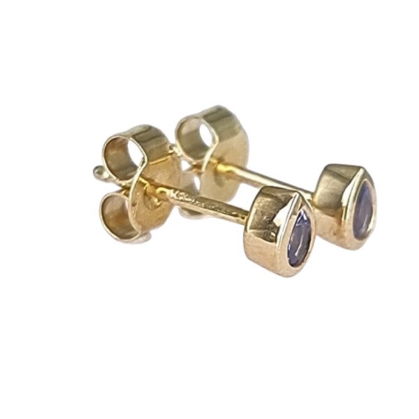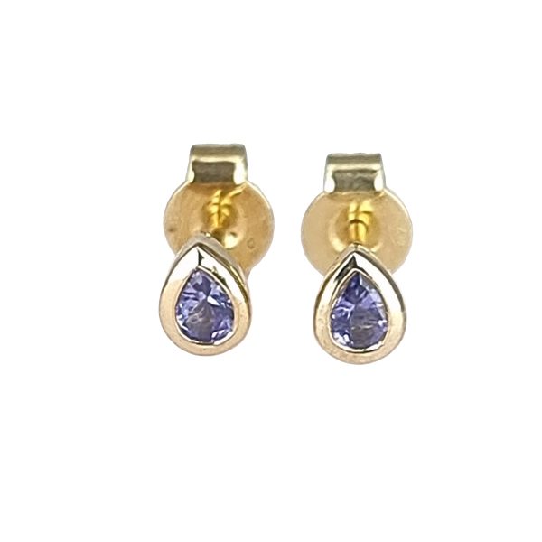 These beautiful natural Tanzanite bezel-set stud earrings are made with simplicity in mind and are set in 10K yellow gold. The earrings each feature a genuine 4mm * 3mm (approx dimensions) pear-shaped Tanzanite stone and have a push back lock for easy wear.