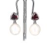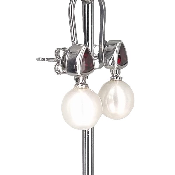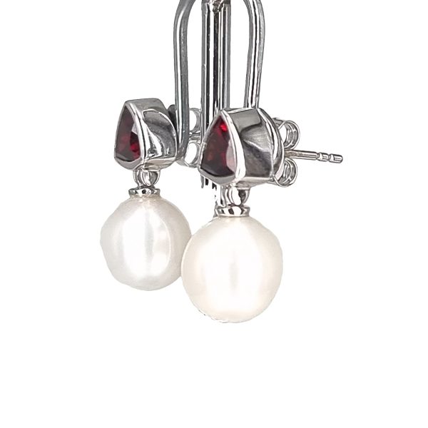 White gold 9k Red garnet and Fresh water White pearl earrings.